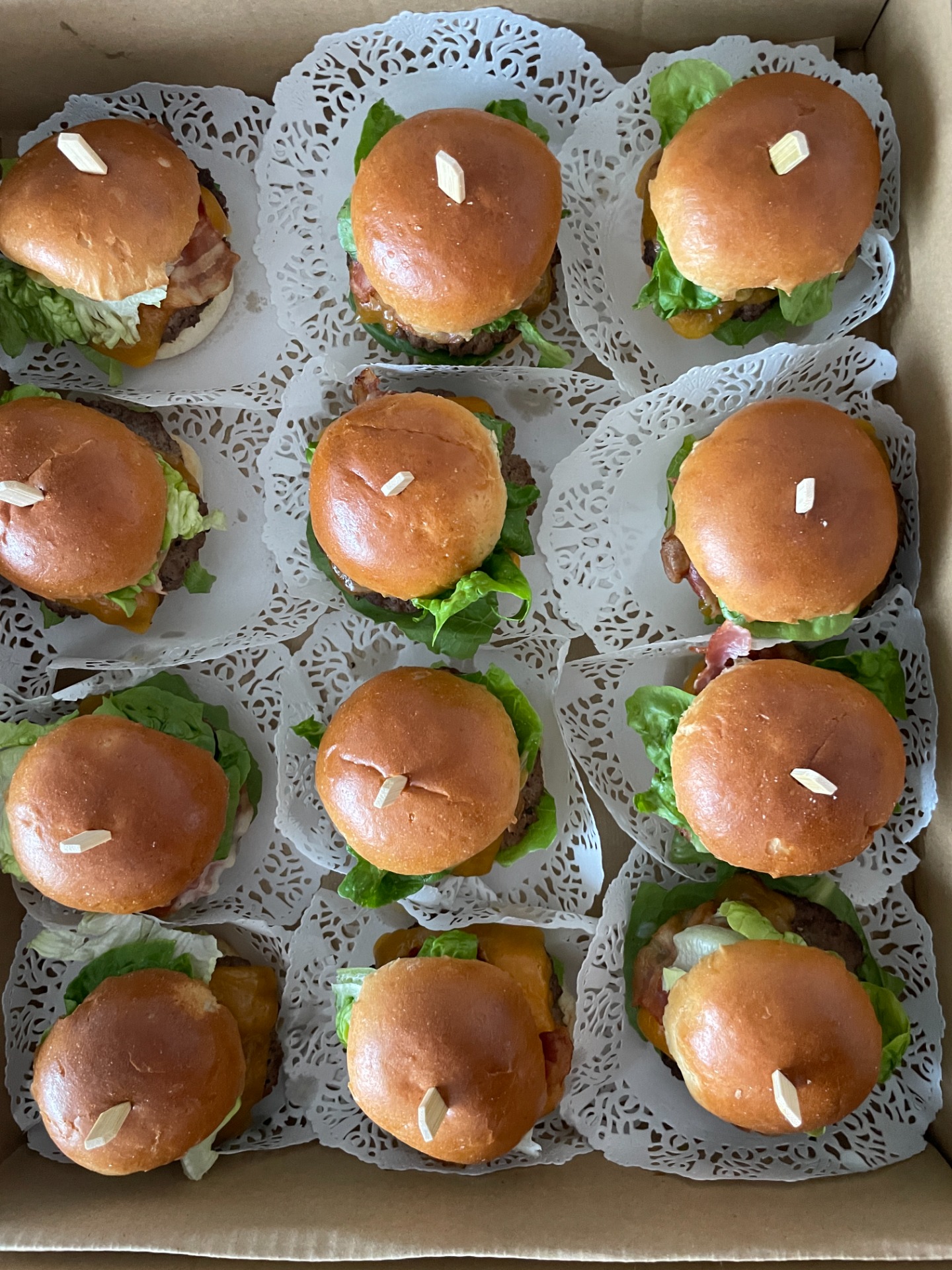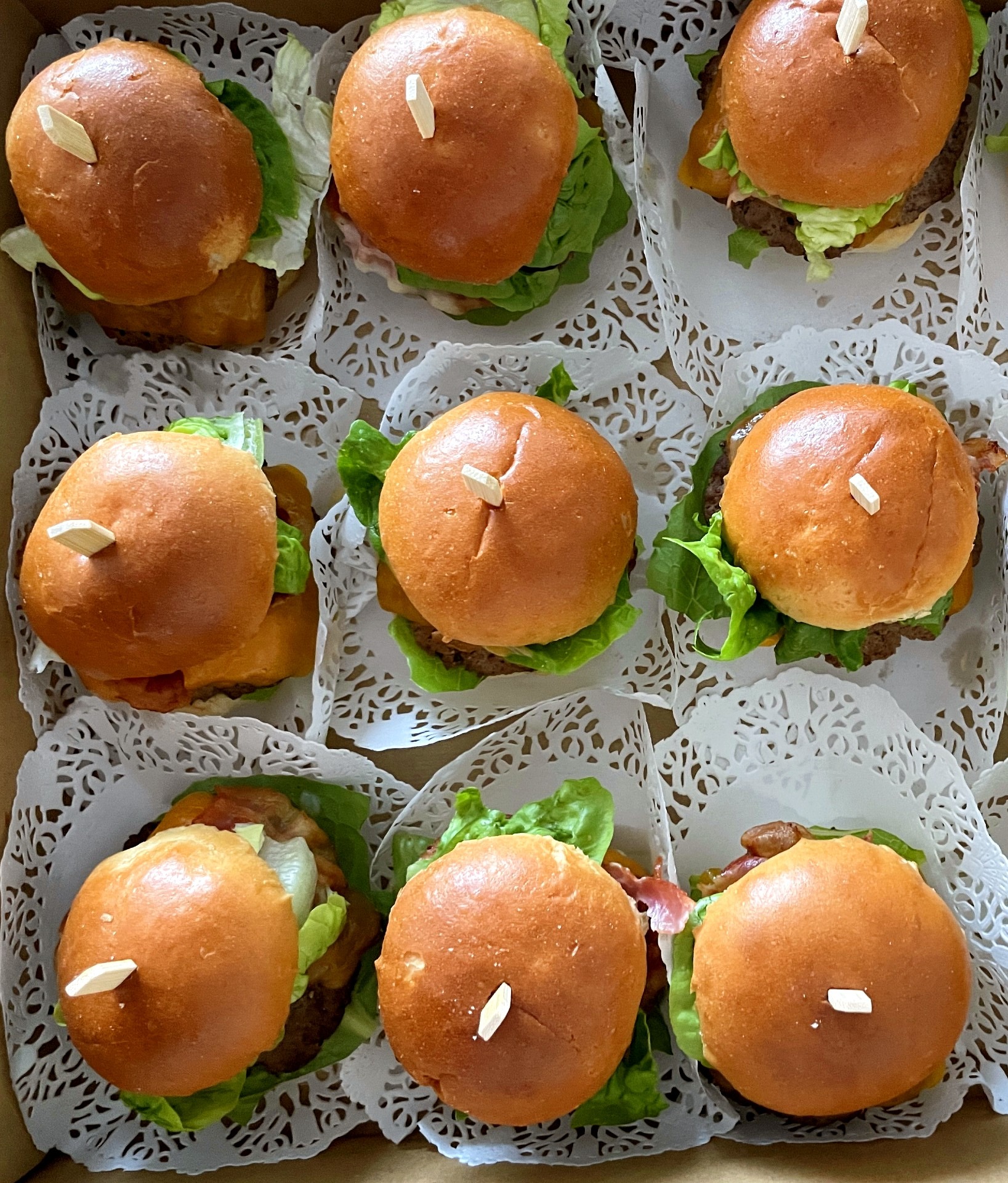 - Mini burger KURACÍ: mini burger (25 g), pečená anglická slanina, kuracie mäso, horčicový párty dresing, šalát.