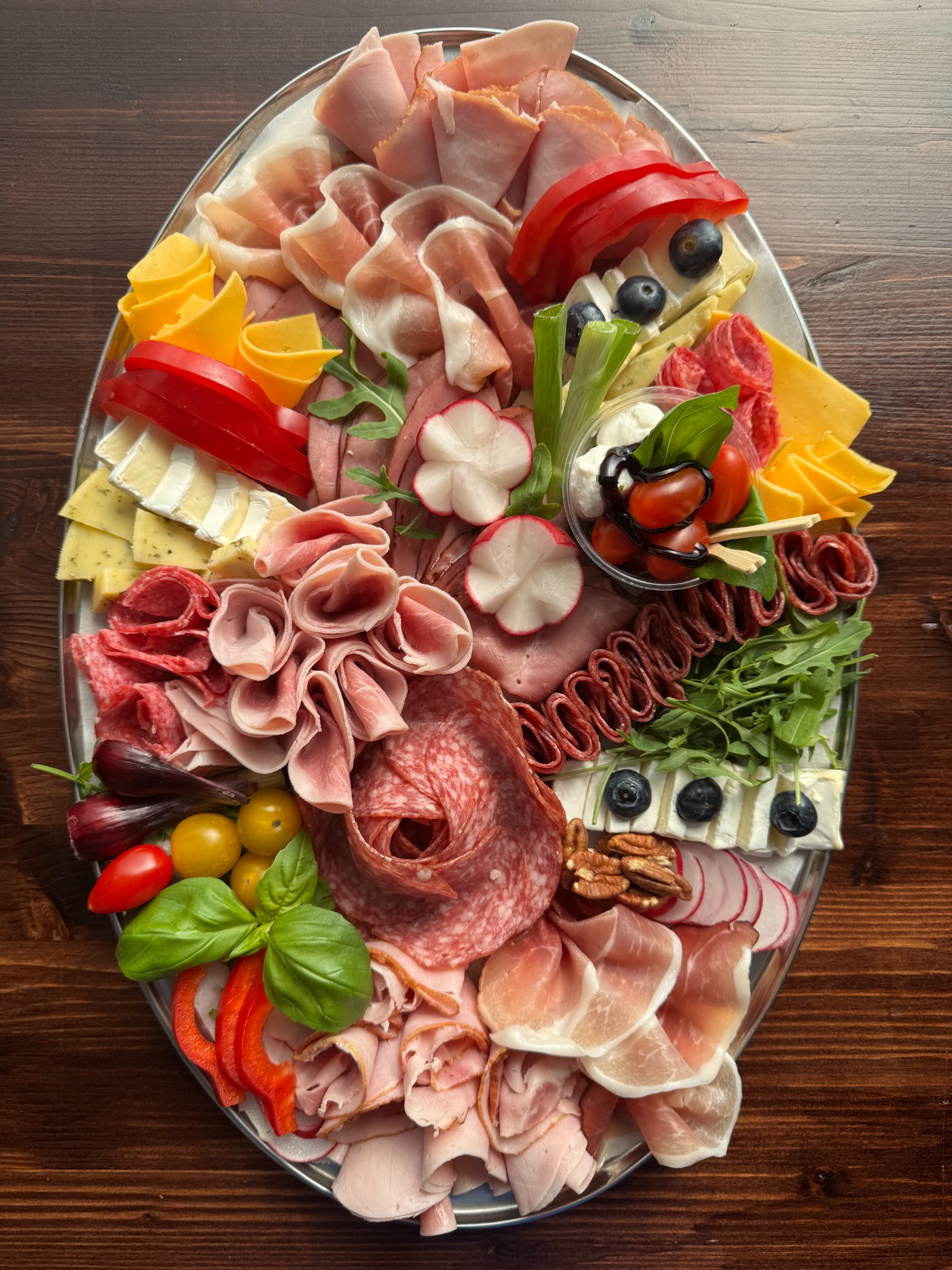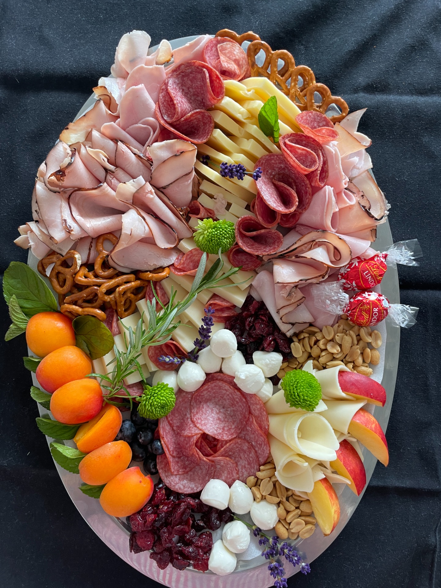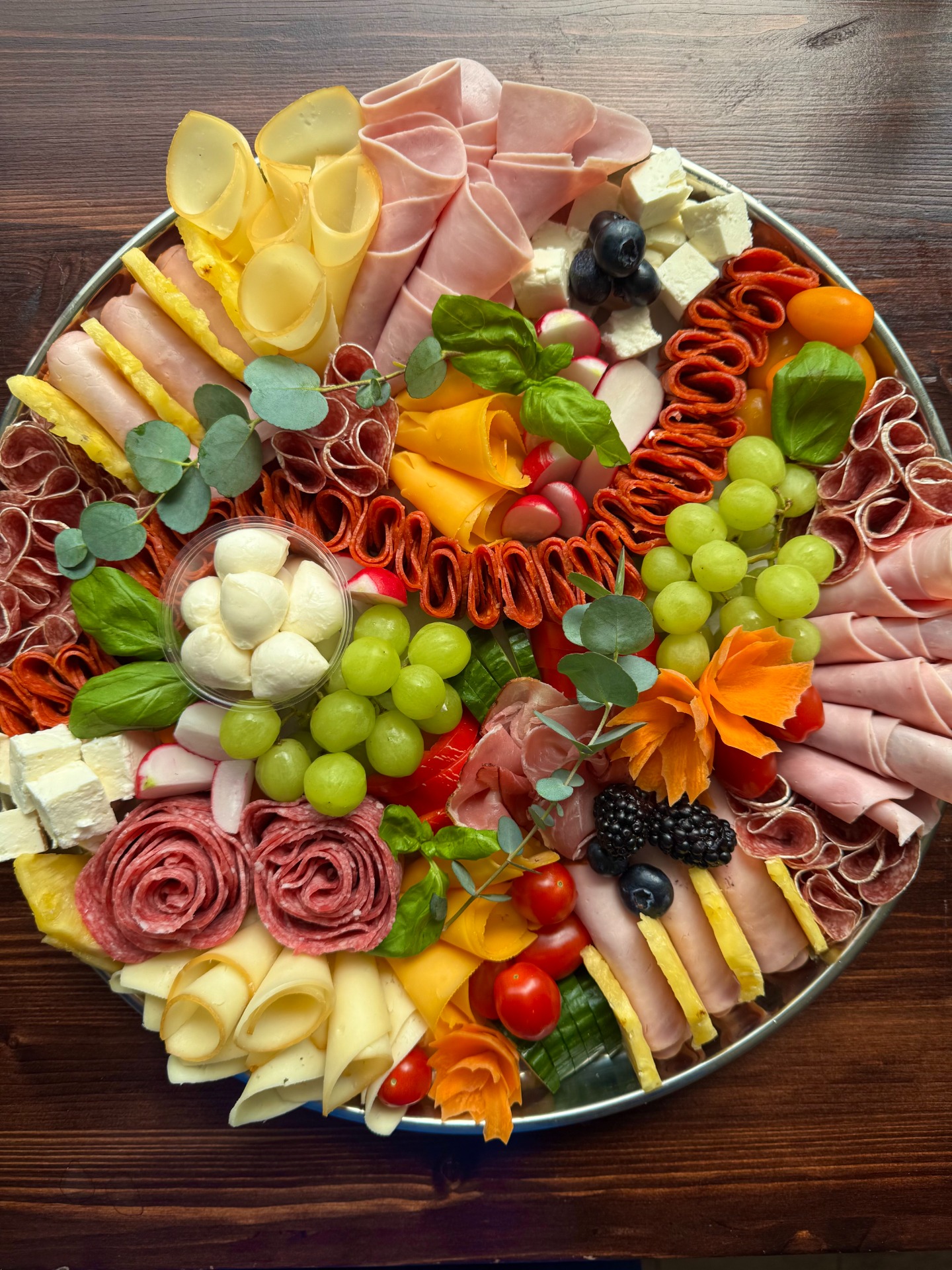 Zloženie: šunka najvyššej akosti, salámy, údeniny, rôzne druhy syrov, ovocie, zelenina, sladkosti, krekry, kvetinové dekorácie atď.
