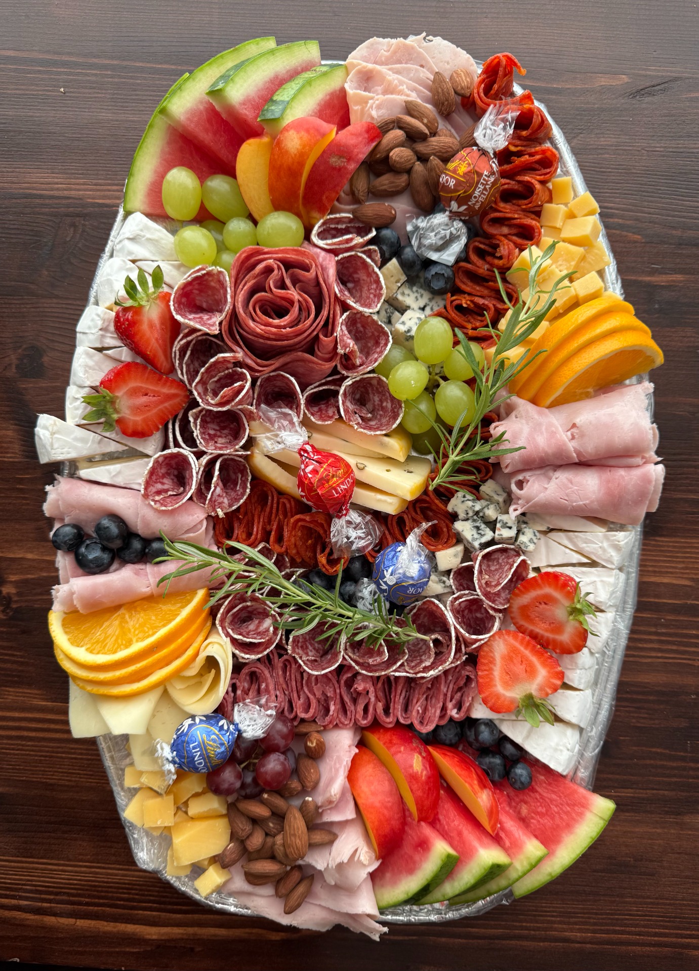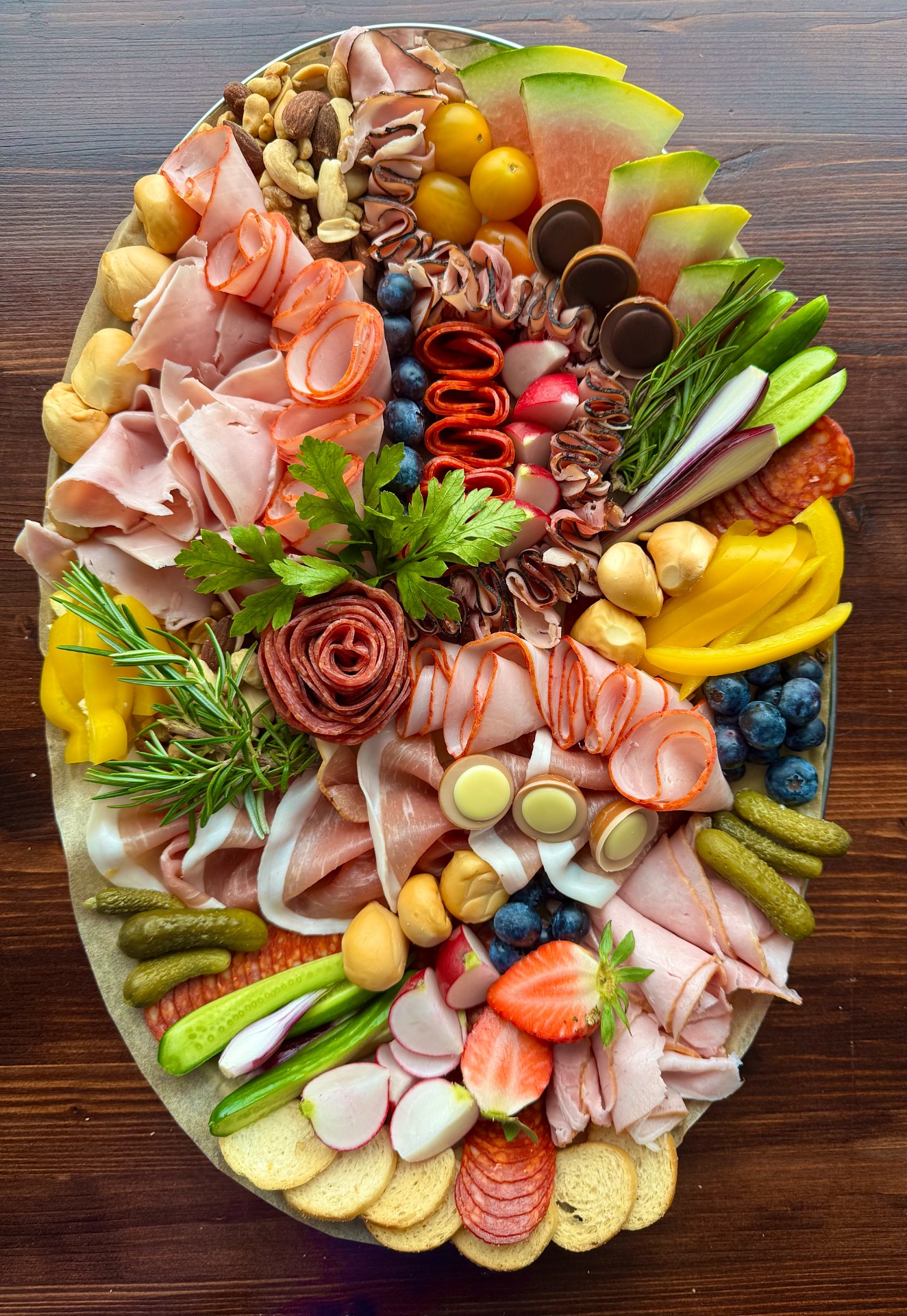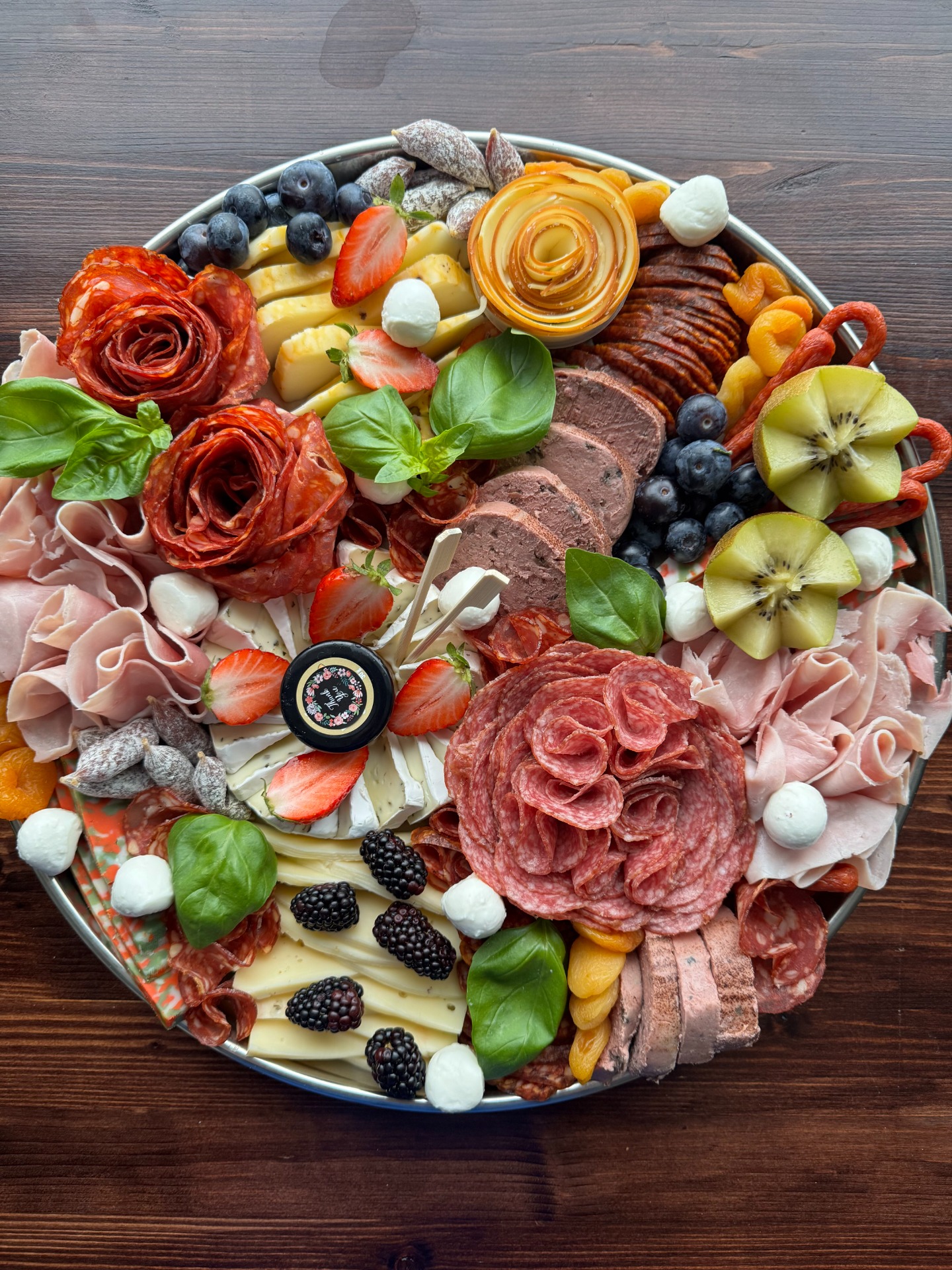 Zloženie: šunka najvyššej akosti, salámy, údeniny, rôzne druhy syrov, ovocie, zelenina, sladkosti, krekry, kvetinové dekorácie atď.