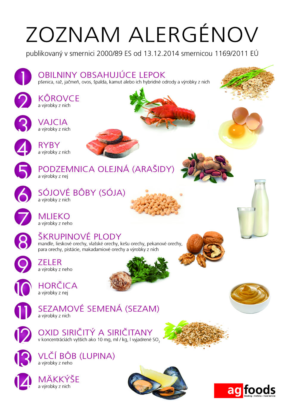 Označovanie : § 9 Zákona NR SR č.152/1995 Z. z . o potravinách v platnom znení, výnos MP SR a MZ SR č. 1187/2004-100, ktorým sa vydáva 2. hlava Potravinového kódexu SR (aktualizované výnosom č.1761/2005-100, aktualizované výnosom č.3069/2005-100, aktualizované výnosom č. 3493/2005-100, aktualizované výnosom č.2319/2007-100) Povinnosť označovať prítomnosť alergénov v potravinách vyplýva zo Smernice Európskeho parlamentu a Rady 2003/89/ES, ktorou sa mení a dopĺňa smernica 2000/13/ES pokiaľ ide o označovanie zložiek prítomných v potravinách a z Výnosu Ministerstva pôdohospodárstva SR a Ministerstva zdravotníctva SR č. 1187/2004 – 100, ktorým sa vydáva hlava Potravinového kódexu SR upravujúca označovanie potravín (v znení výnosov č.1761/2005100, č. 3069/2005100, č. 3493/2005100 a č. 2319/2007100).